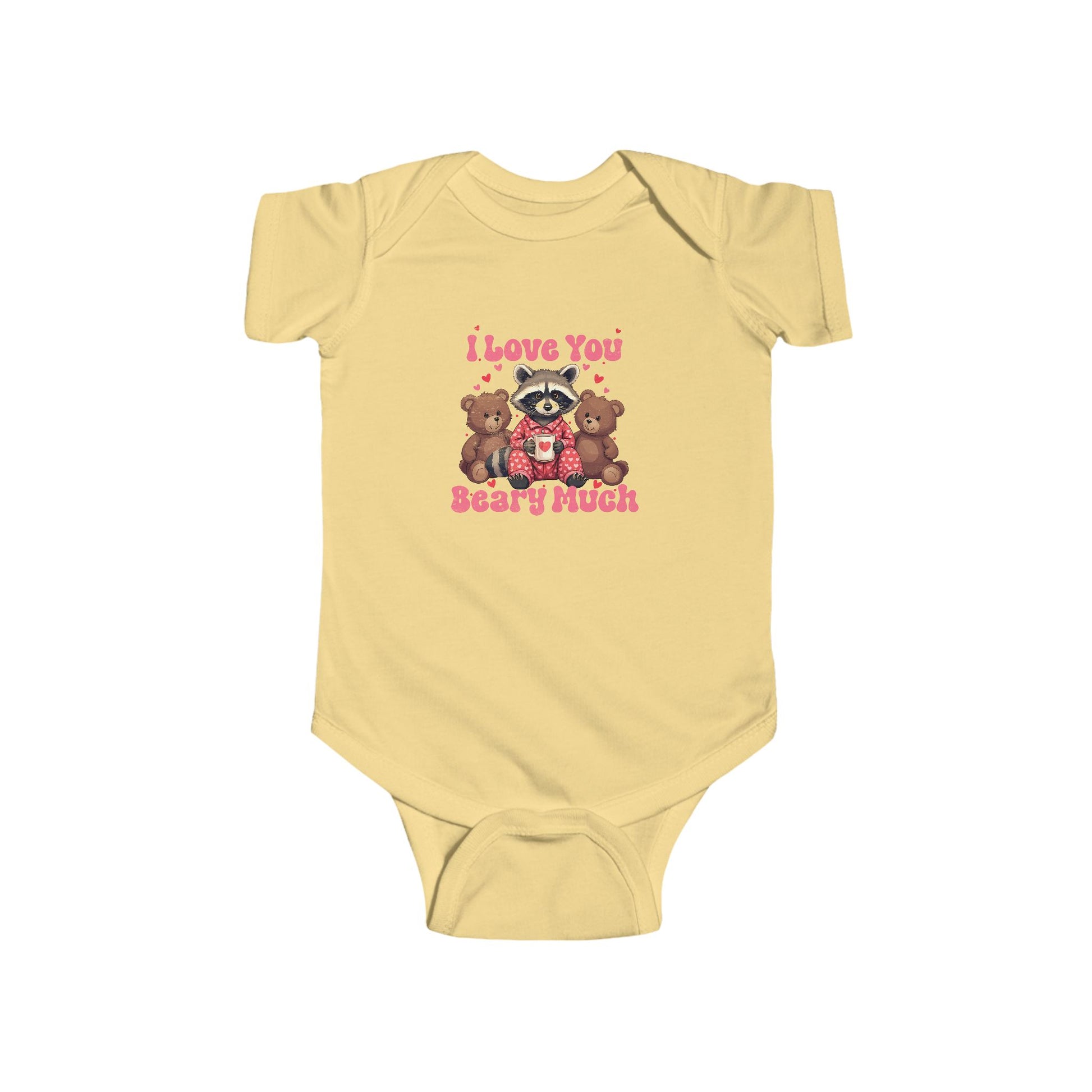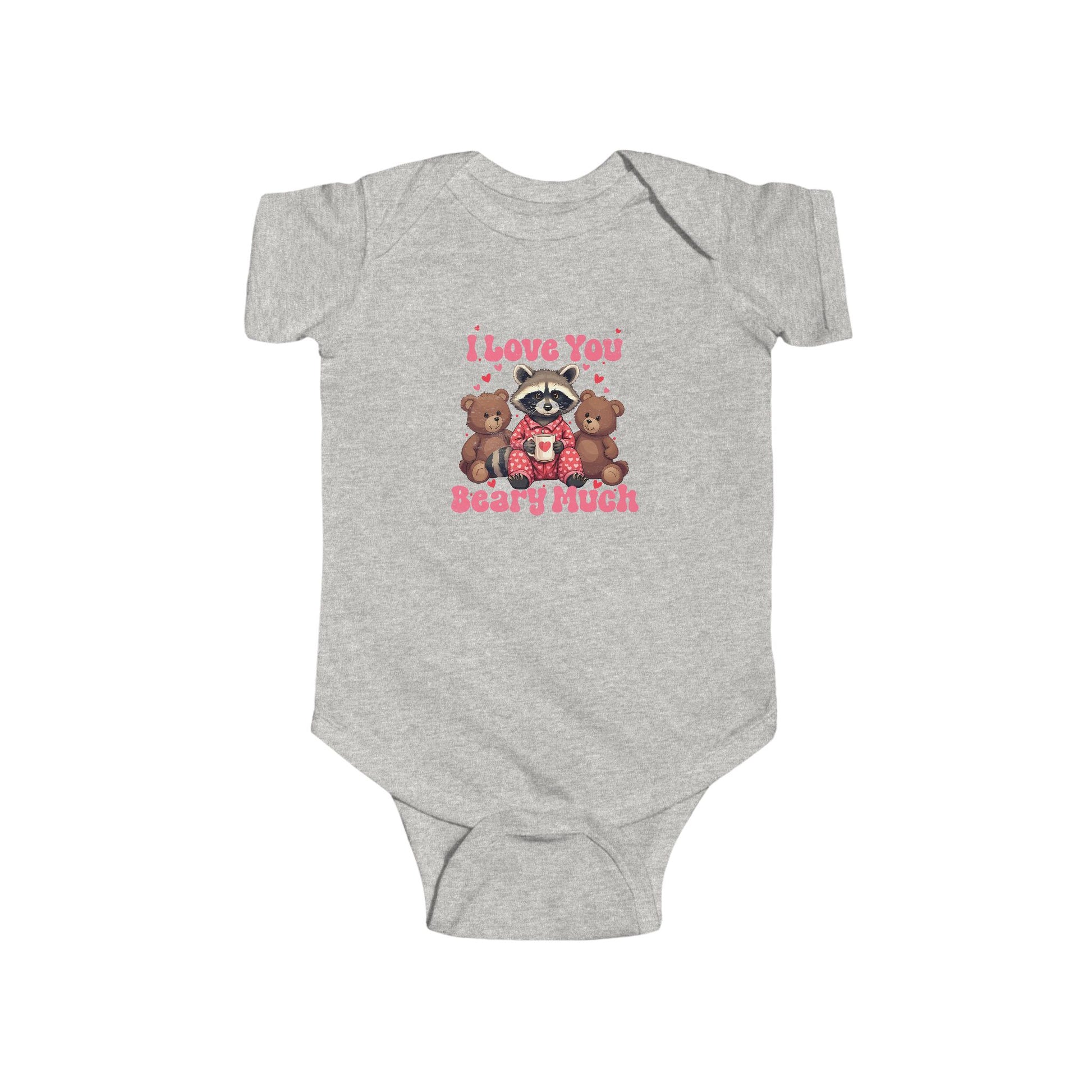 This adorable Bodysuit features a charming design of a Baby Raccoon and Teddy Bears with the words 'I love you beary much,' making it a perfect baby shower gift. The soft fabric and ribbed knit binding provide comfort and freedom of movement for infants. Ideal for parents looking for a cute and cozy outfit for their little one.