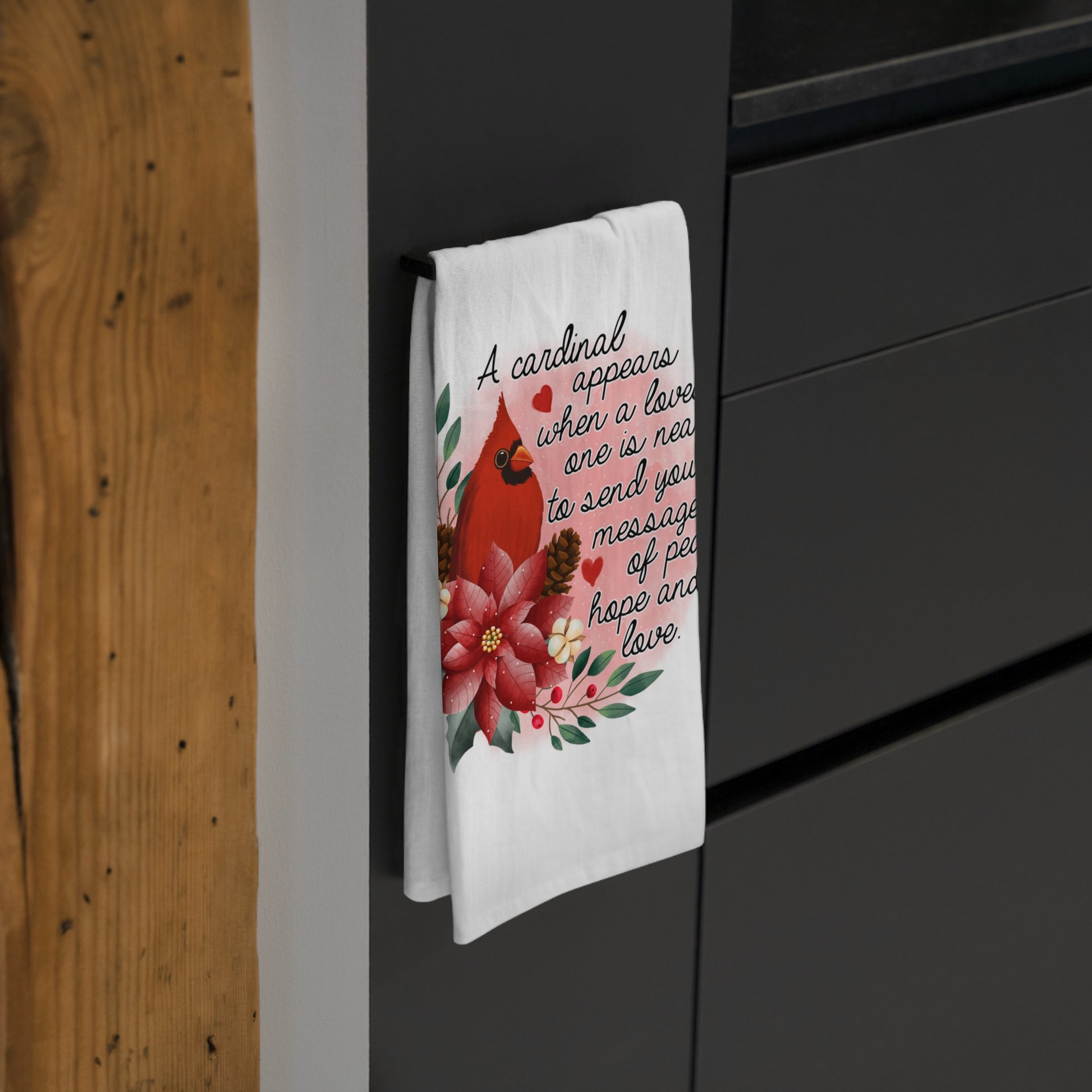 Elevate your kitchen decor with this beautifully designed Tea Towel, perfect for adding a touch of warmth and charm to your space. Featuring a heartfelt design that reads, "A cardinal appears when a loved one is near to send you a message of peace, hope and love," it inspires a cozy and inviting atmosphere. Ideal for home chefs, holiday gatherings, or as a thoughtful gift, this tea towel brings a sense of nostalgia and comfort, making it a lovely addition to any kitchen. Perfect for the winter holidays, housewarming events, or as a heartfelt gift for friends and family, this tea towel is both practical and meaningful.