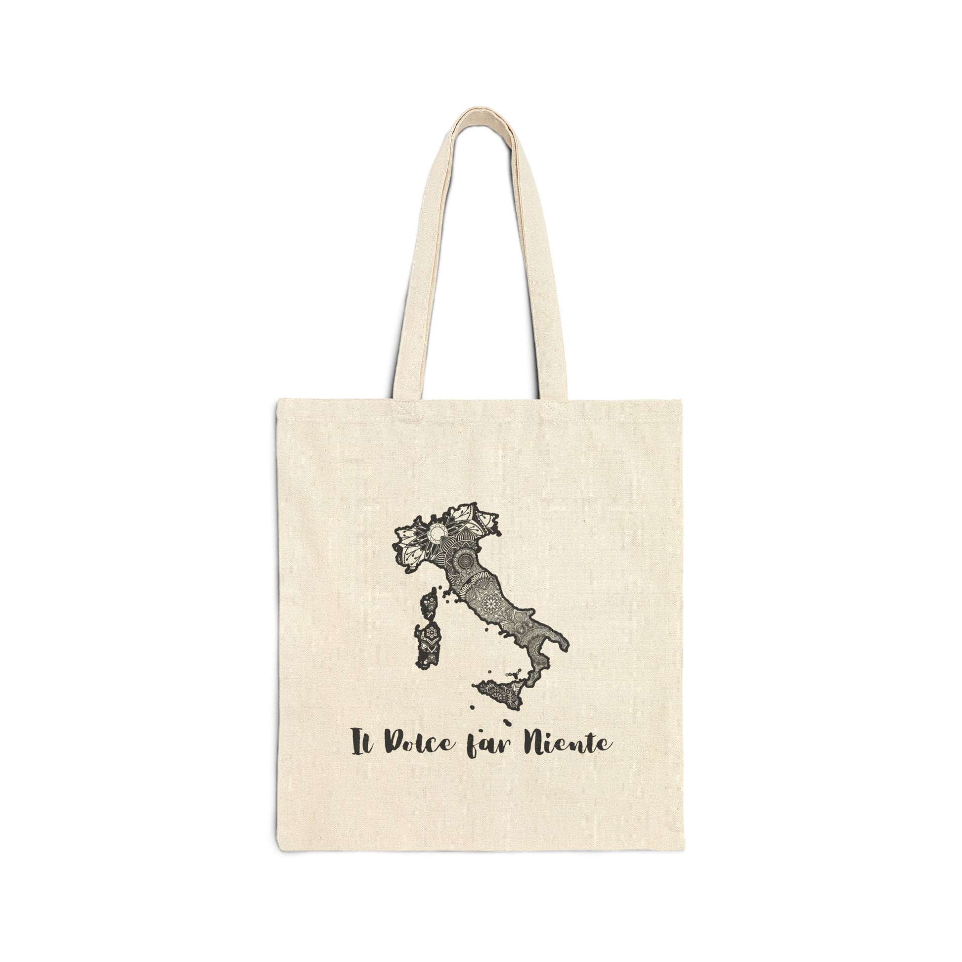 This cotton canvas tote bag features a beautiful design inspired by the concept of 'il dolce far niente'. Perfect for those who appreciate Italian culture and want a stylish accessory for their everyday needs. Ideal for adults looking to add a touch of tranquility to their busy lives. Great for gifting on special occasions like birthdays or as a treat for yourself.