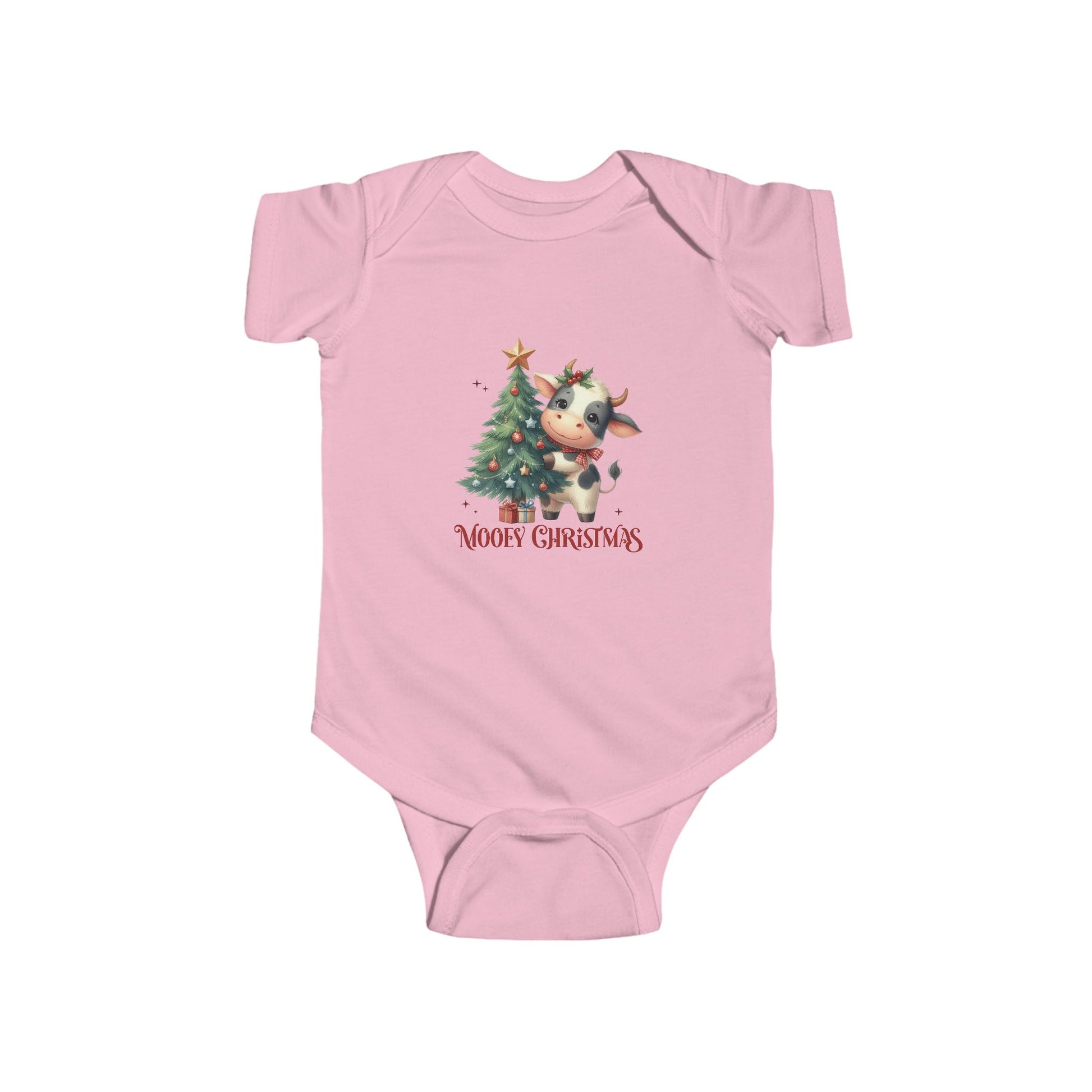 A soft, lightweight infant bodysuit printed with a sweet holiday illustration: a smiling calf beside a decorated Christmas tree with the words “Mooey Christmas.” The gentle fabric and ribbed neck opening make dressing and undressing simple, while the side seams and quality stitching keep the shape through washes. Snaps at the crotch allow quick diaper changes so parents can spend less time fussing and more time enjoying cuddles and festive moments. REACH-certified materials and a tear-away label add comfort and safety for sensitive baby skin. This piece brings a touch of cozy, whimsical charm to family photos, holiday visits, or quiet mornings by the tree.
