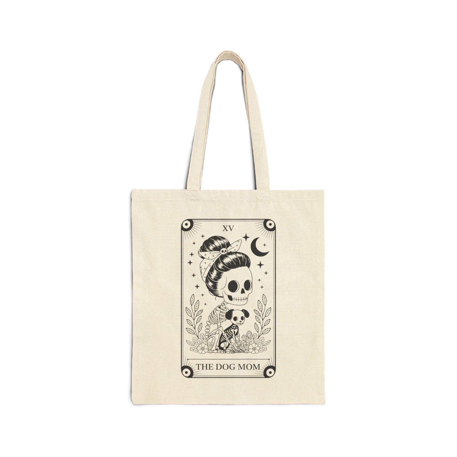 A cotton canvas tote bag featuring a unique design of a dog mom tarot card with a skeleton theme. Perfect for those who love dogs, tarot cards, and unique designs. This tote bag adds a quirky and edgy vibe to any outfit and is ideal for carrying daily essentials. Great for dog lovers, tarot enthusiasts, and those who enjoy unconventional accessories. Suitable for Halloween, Day of the Dead, and everyday use.