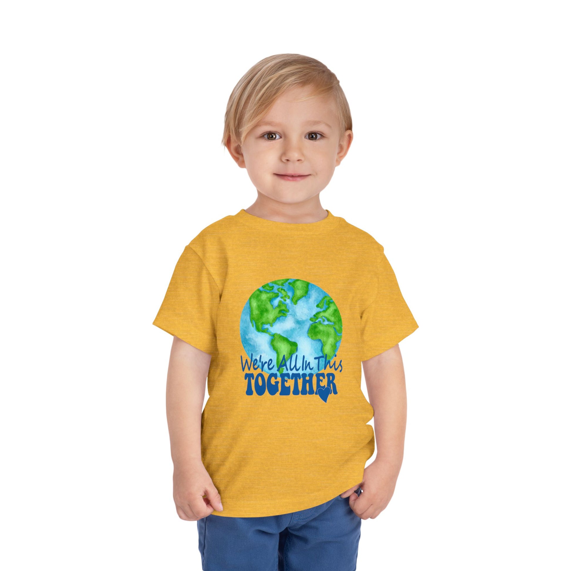 Introduce your little one to the world with our delightful Toddler Short Sleeve Tee. Featuring a vibrant globe design and the uplifting message, "We're All In This Together," this tee radiates positivity and connection. Its light, soft fabric ensures your toddler stays comfortable all day long, making it perfect for playdates, family gatherings, or casual outings. This tee is ideal for parents looking to promote unity and kindness among their children. Celebrate Earth Day, family events, or simply brighten up everyday wear with this charming shirt. It’s an essential addition to any toddler's wardrobe, inviting creativity and love for the planet!