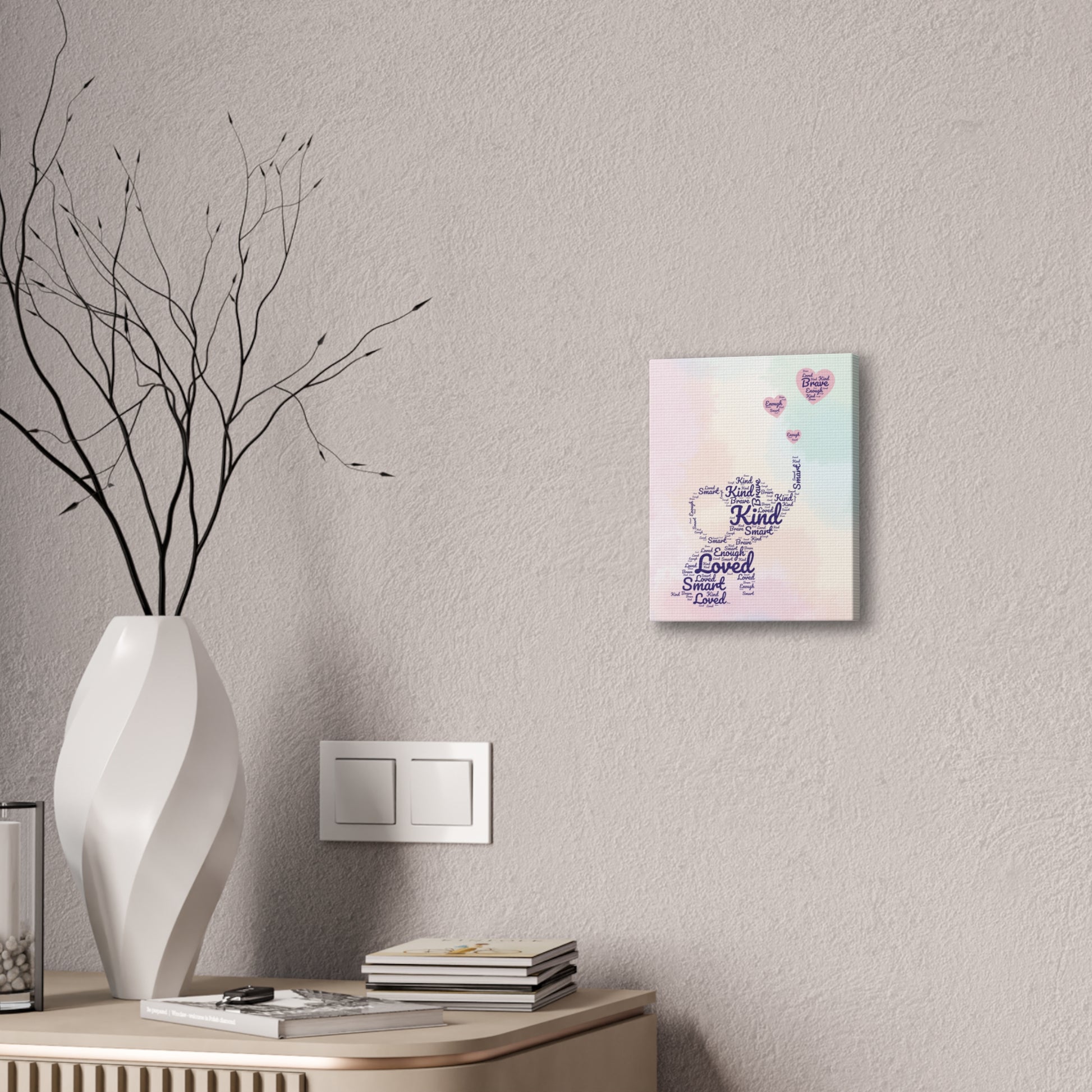 A softly uplifting stretched canvas that brings gentle encouragement into any room. Muted watercolor pastels form a calm background while a word-art elephant—composed of affirmations like “Kind,” “Loved,” and “Smart”—reaches up toward tiny heart-shaped balloons. The visual reads as both nursery-friendly and quietly inspirational, offering warmth without shouting. Lightweight yet sturdy on a pine frame, the artwork arrives gallery-ready with mounting hardware and subtle QR detail on the back. It settles into a reading nook, bedroom, or play space and becomes a small daily reminder of kindness and belonging.