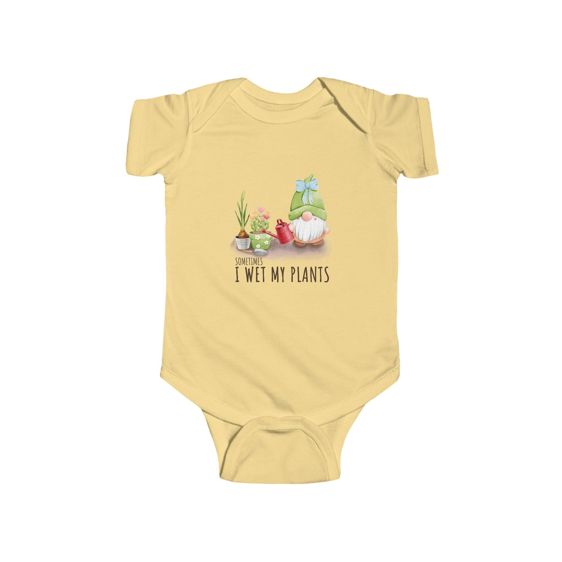Soft, light, and playfully illustrated — this infant bodysuit brings a little garden of joy to everyday wear. The delicate watercolor gnome and potted plants sit above a cheeky line that reads “I wet my plants,” adding a wink of humor to nap time, playtime, and strolls around the neighborhood. The ribbed neck and snaps at the crotch make dressing and diaper changes quick and gentle, while the smooth, strong fabric holds color and shape so the print keeps looking fresh. Breathable and easy to layer, this bodysuit fits right into days filled with tiny adventures and cozy laps on the couch.