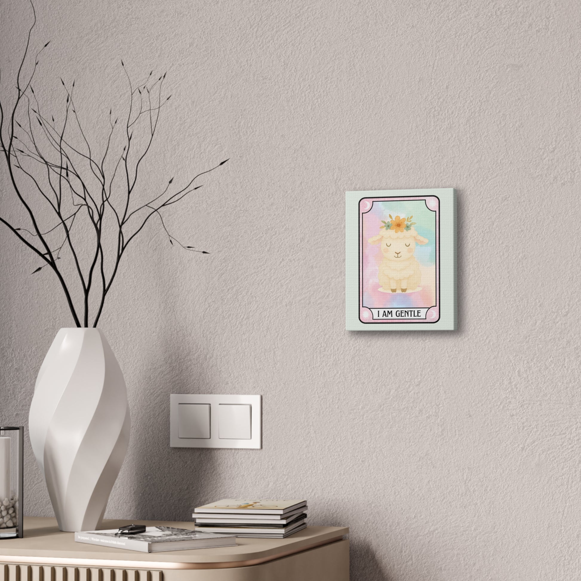 This stretched canvas brings a soft, soothing presence to any room. A pastel watercolor background cradles a sleepy lamb crowned with tiny flowers, framed like a gentle tarot card that reads “I AM GENTLE.” Light mint borders and delicate corner details keep the look airy and calm. Hung in a nursery, meditation nook, or beside a cozy reading chair, it quietly reminds you to slow down and be kind to yourself.