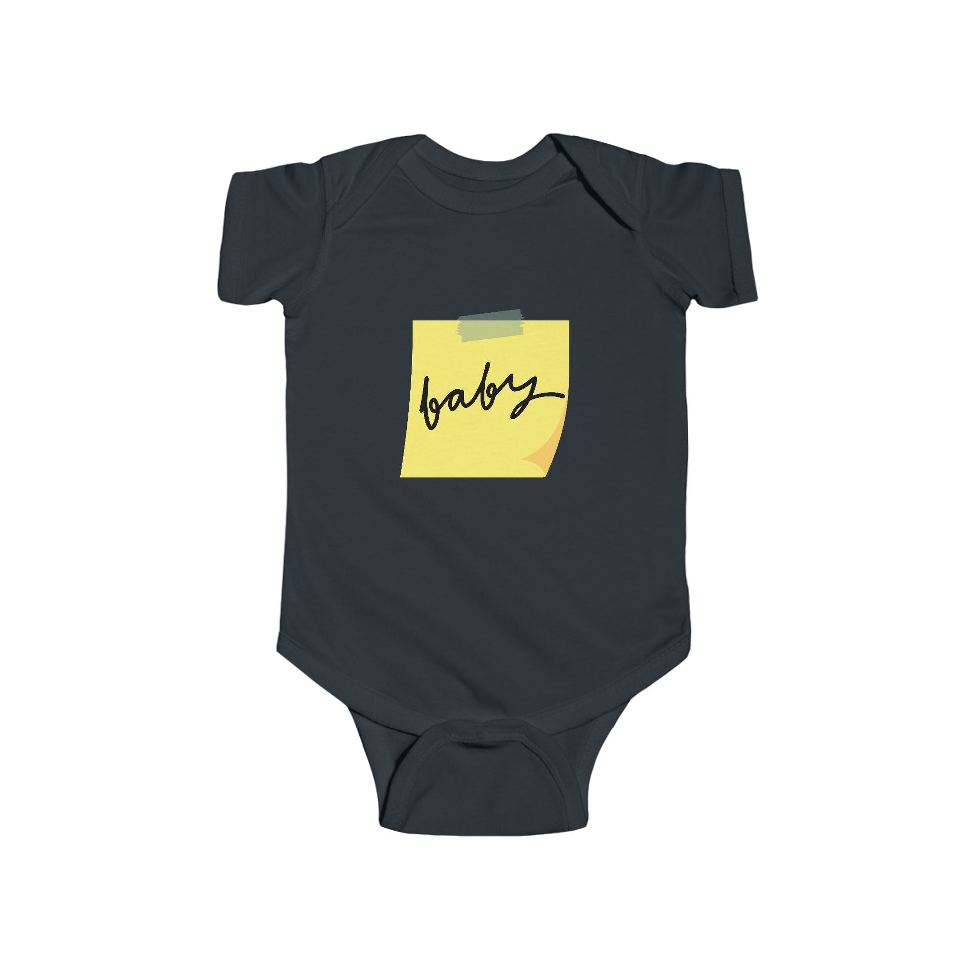 Funny and cute bodysuit designed for forgetful parents of infants. Perfect for notetakers and list writers, this post-it note inspired bodysuit adds a touch of humor to everyday baby care. Relevant for baby showers, birthdays, or just to bring a smile to new parents' faces.