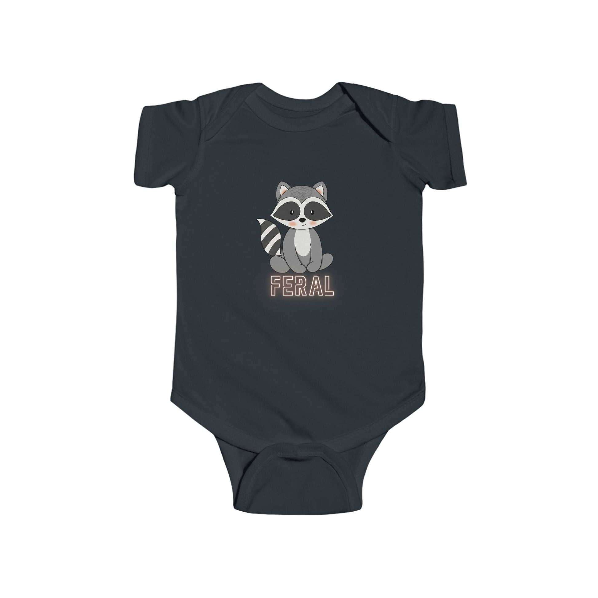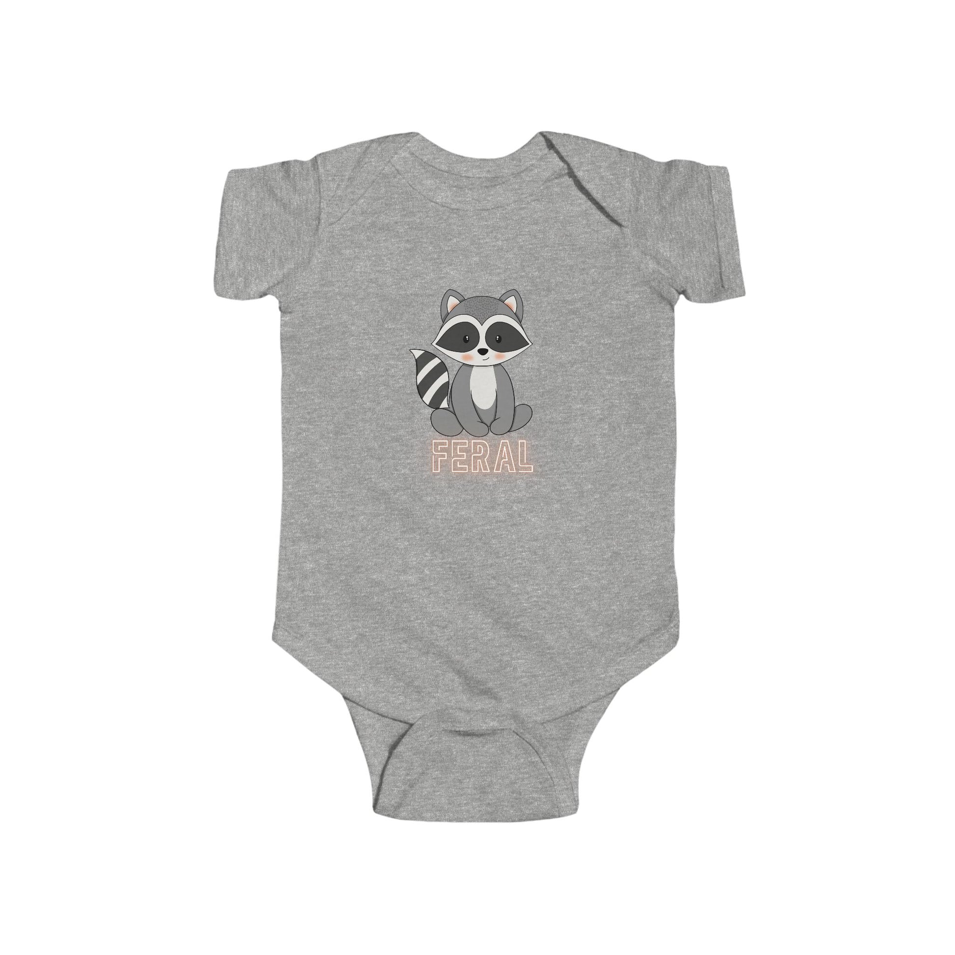 This cute and funny bodysuit features a feral baby raccoon design, perfect for the wild child in your life. Made from soft and smooth fabric, this bella+canvas bodysuit is an ideal baby gift. Suitable for infants, this onesie is a great addition to any little one's wardrobe, especially for nature-loving families or those who appreciate unique, playful designs. Perfect for baby showers, birthdays, or just everyday wear.