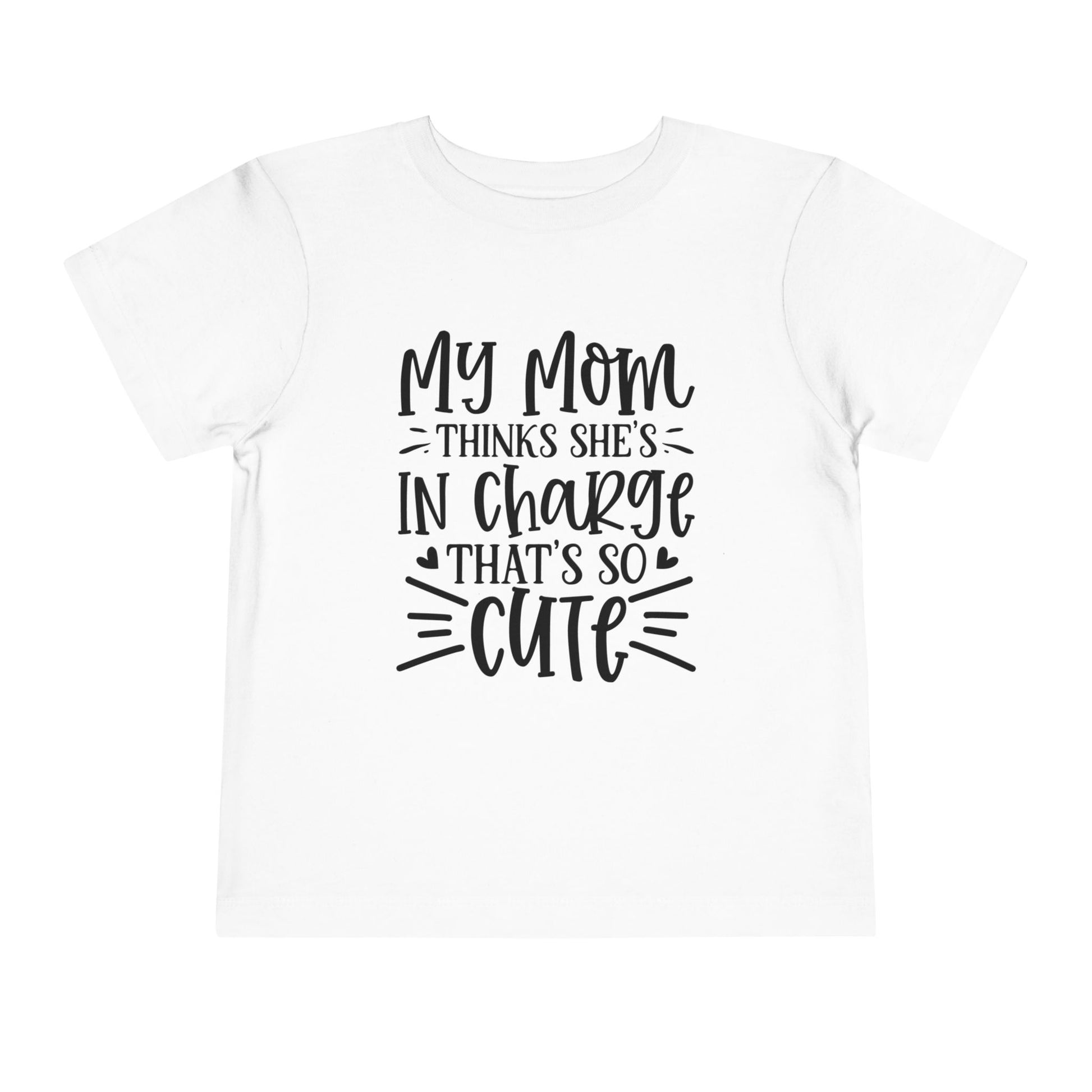 Funny toddler tee with the quote 'My mom thinks she's in charge, that's so cute'. Perfect for young kids with a sense of independece, parents with a sense of humor, and great for a gift from a grandma. This tee is light, comfy, and perfect for everyday wear or special occasions.