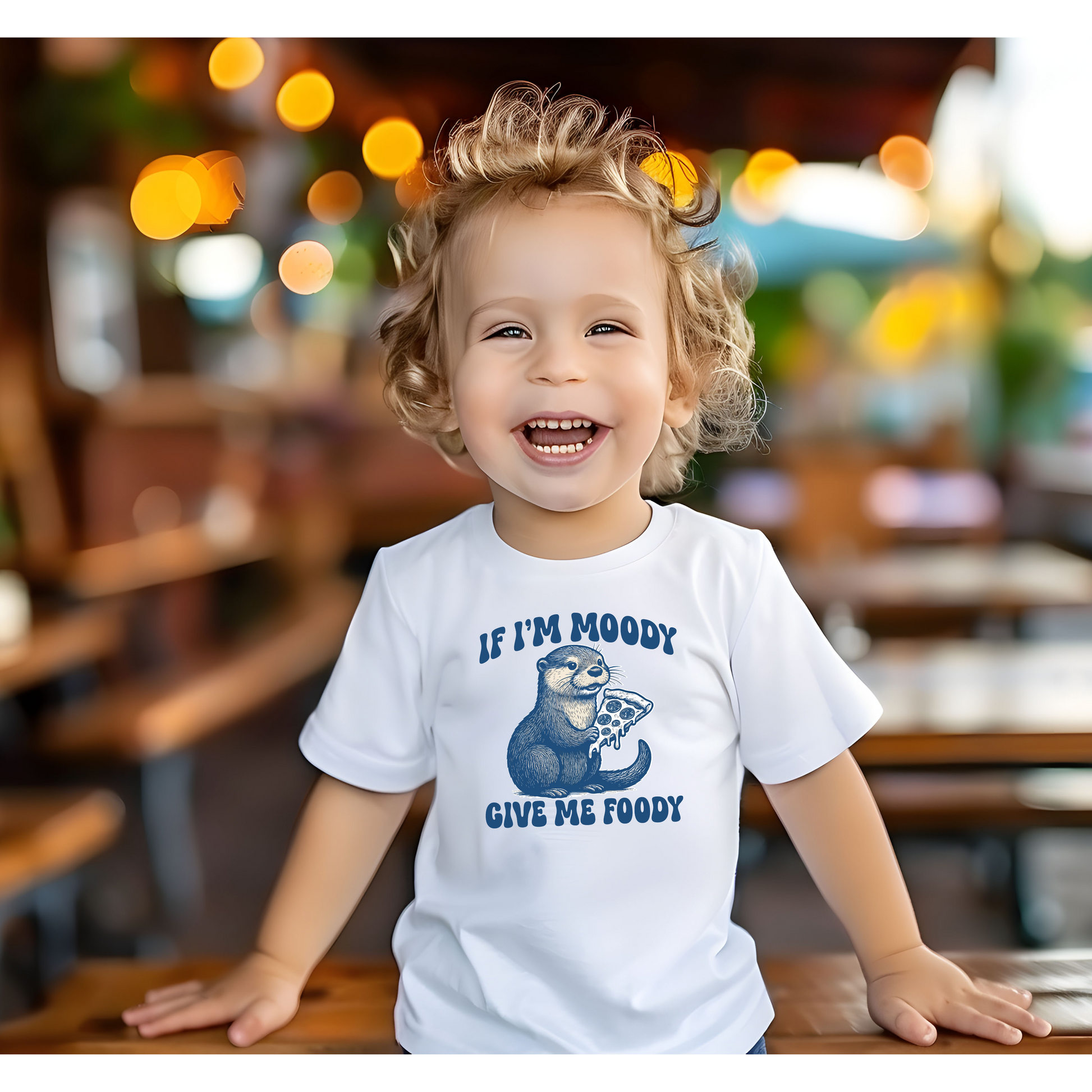 This adorable Toddler Tee features an otter holding a slice of pizza with the funny quote 'If I'm Moody Give me Foody'. Perfect for little ones who are always hungry and love cute animal designs. This Tee is otterly adorable and sure to bring smiles to both kids and parents alike. Ideal for casual wear and playdates, this Tee is relevant to birthdays, holidays, and everyday wear.