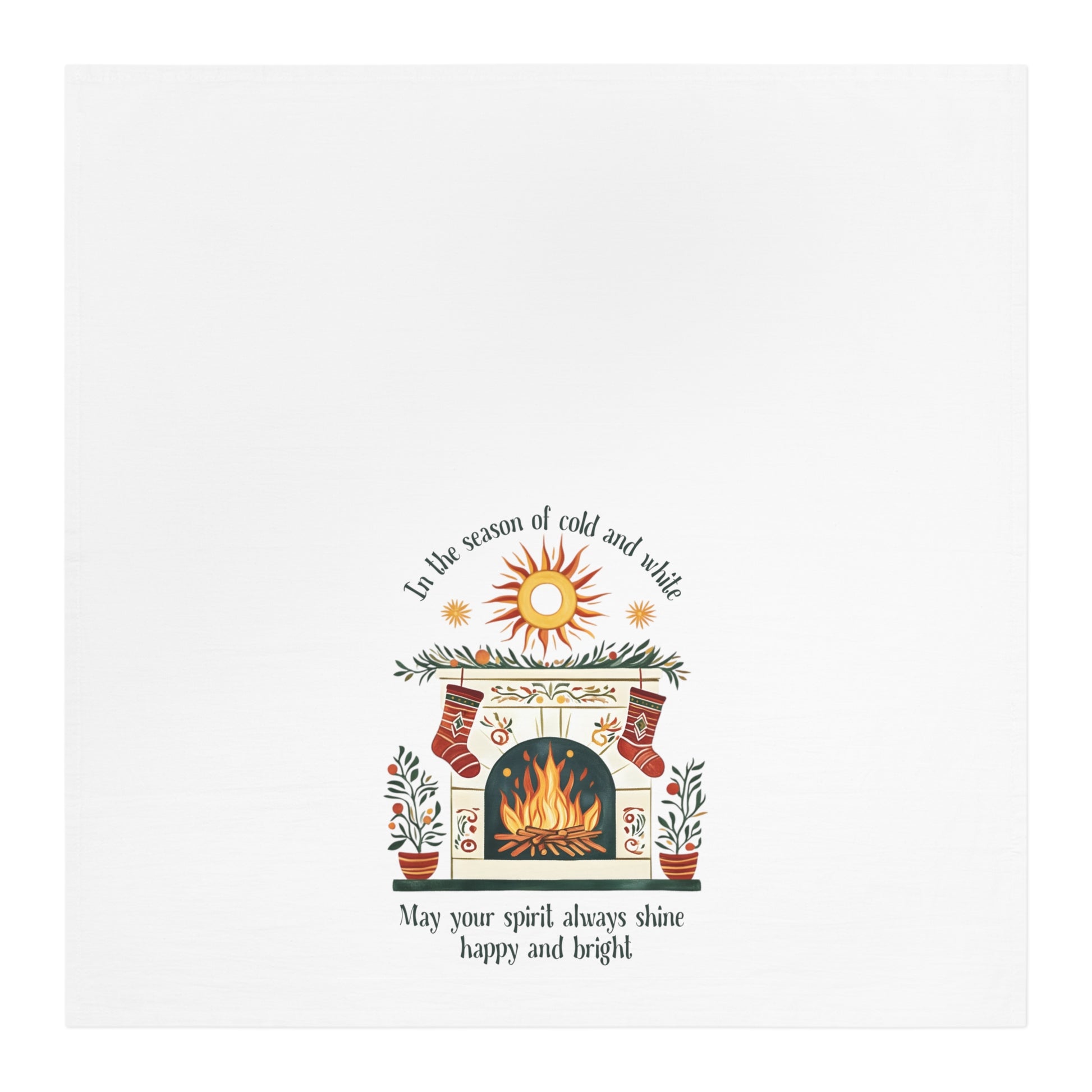 Bring a warm, homey glow into chilly seasons with this illustrated cotton tea towel. A cozy fireplace scene—complete with hung stockings, potted greens, and a sunburst rising above—sits at the center, framed by the gentle message: “In the season of cold and white, may your spirit always shine happy and bright.” The soft, detailed print reads like a small hearth-mounted postcard, perfect for adding comforting charm to kitchen counters, hung on an oven handle, or draped over a bread basket during winter gatherings. The towel’s simple, calm palette and hand-drawn feel create a quiet, uplifting accent that fits into slow-morning routines and festive preparations alike.